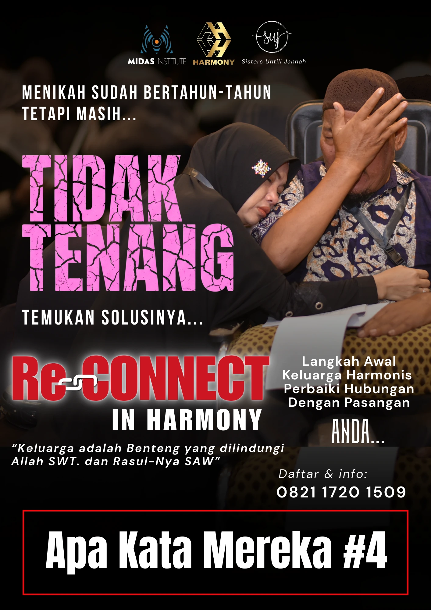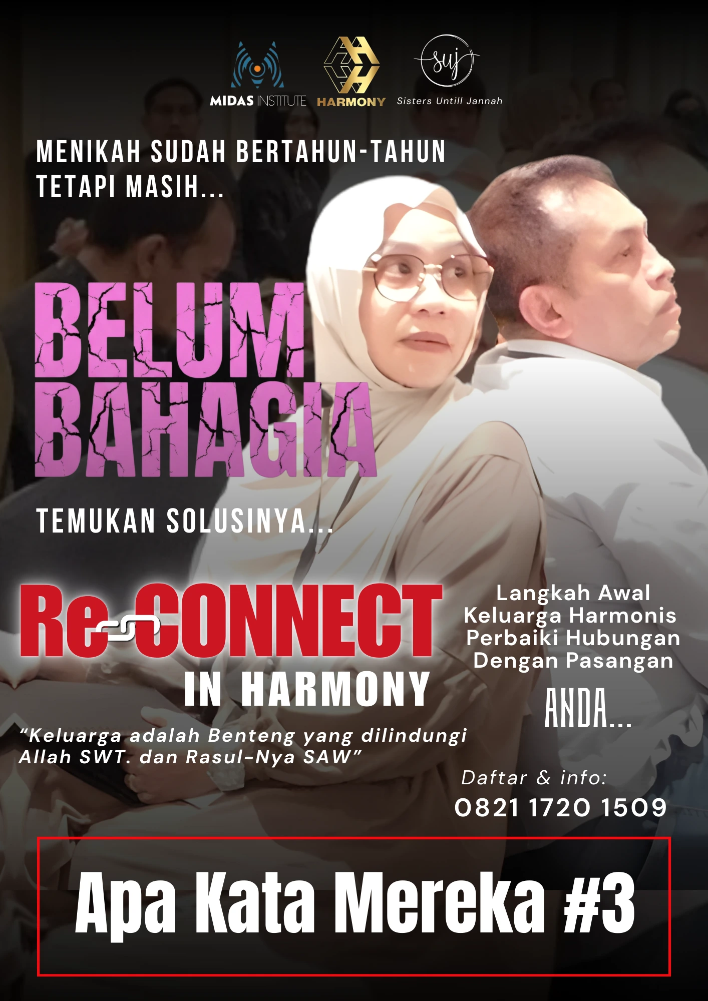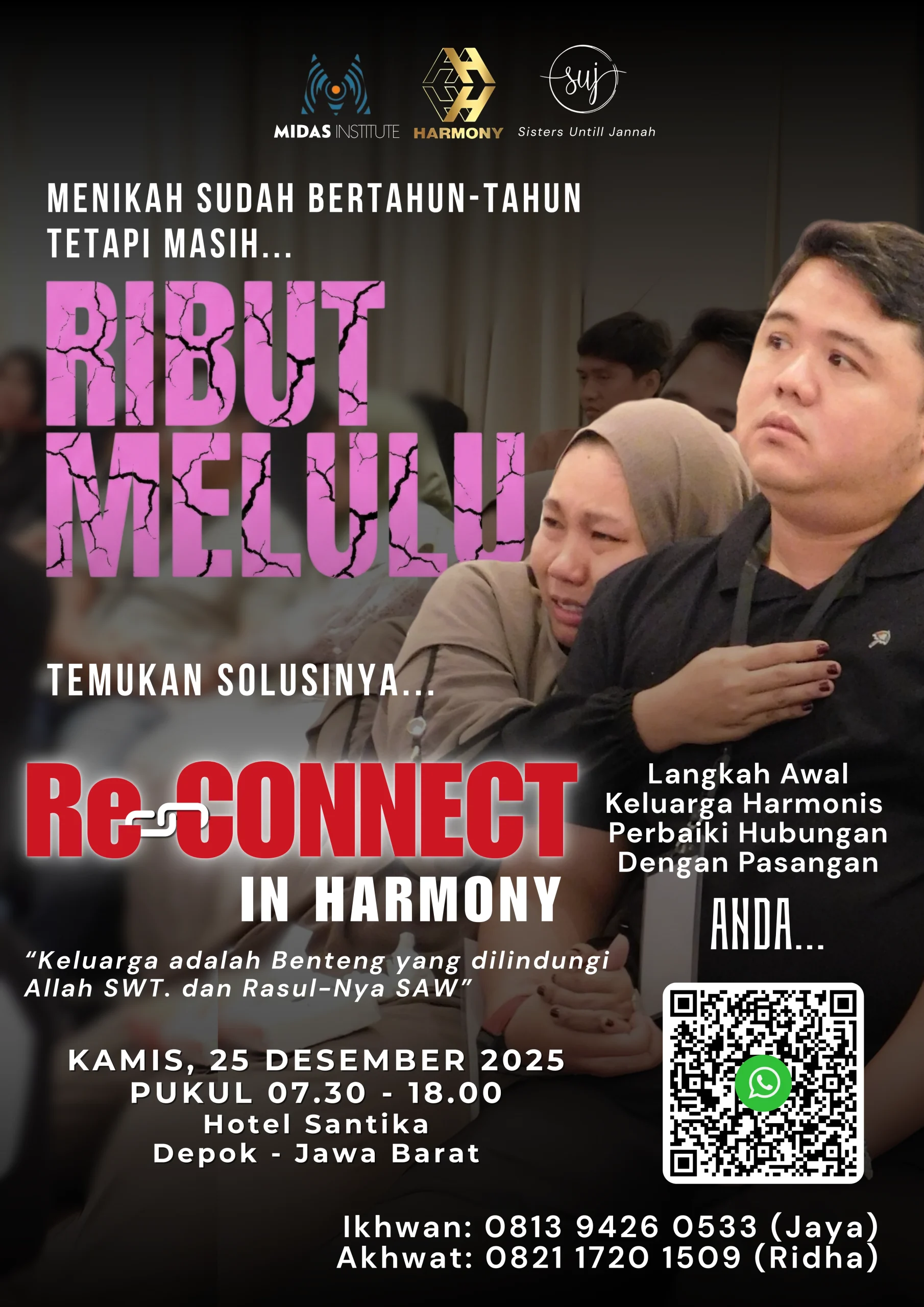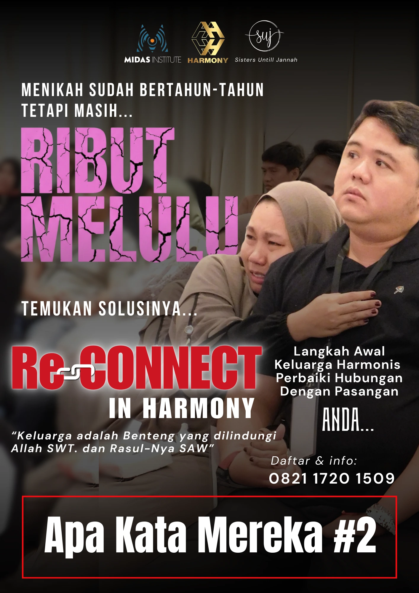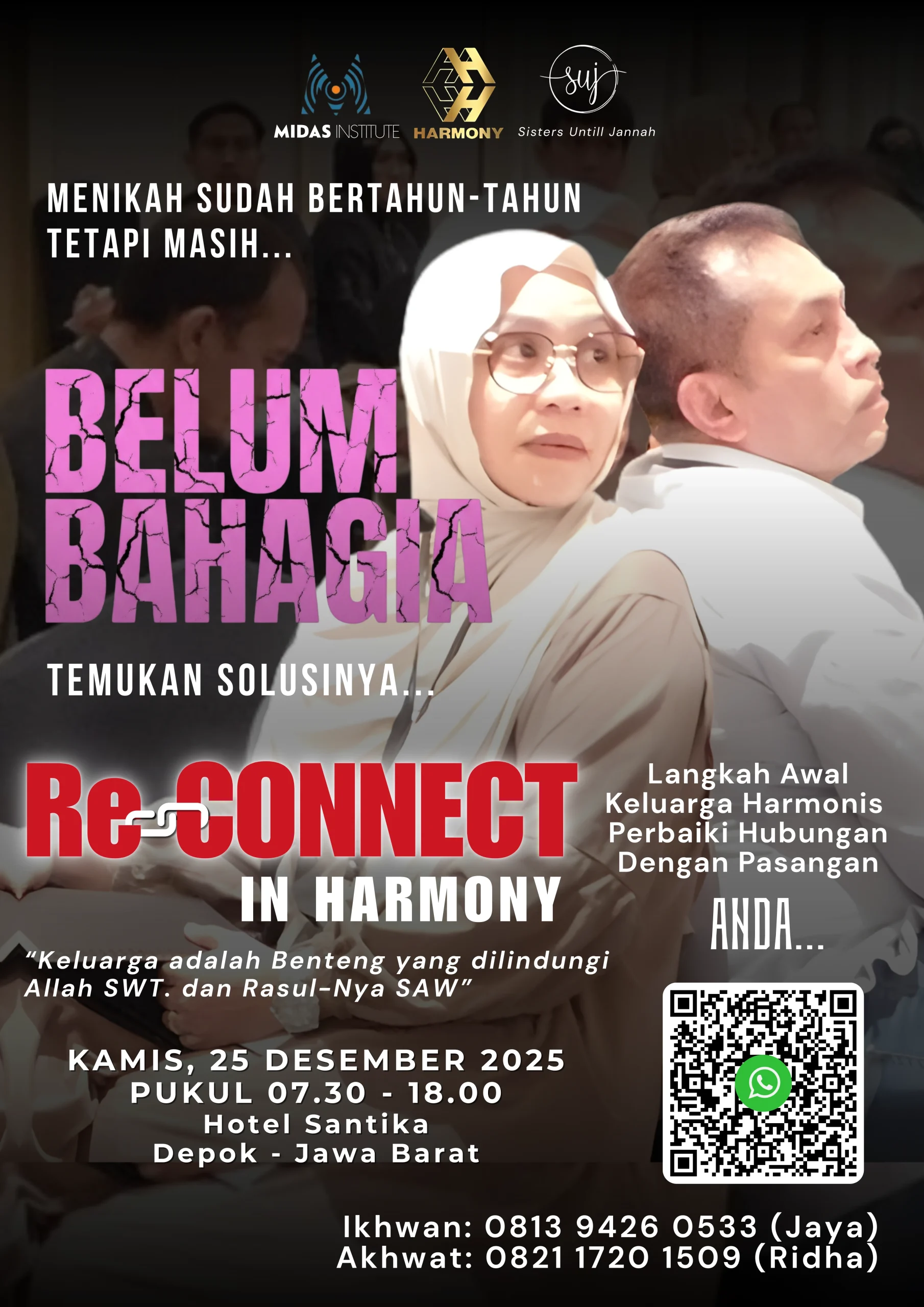 ReCONNECT IN HARMONY disajikan special dari MIDAS Institute. Program ini akan mengungkapkan SUMBER MASALAH UTAMA PASANGAN yang sebenarnya tentang apa yang menyebabkan lebih atau kurang sukses dalam rumah tangga, lebih atau kurang kedamaian batin tanggungjawab sebagai suami istri, hubungan pasangan yang lebih baik atau lebih buruk, Kesehatan mental & emosi pasangan yang lebih baik atau lebih buruk, dan mungkin dianggap sebagai rahasia terbesar bagi teman hidup untuk menuju kehidupan yang lebih baik!