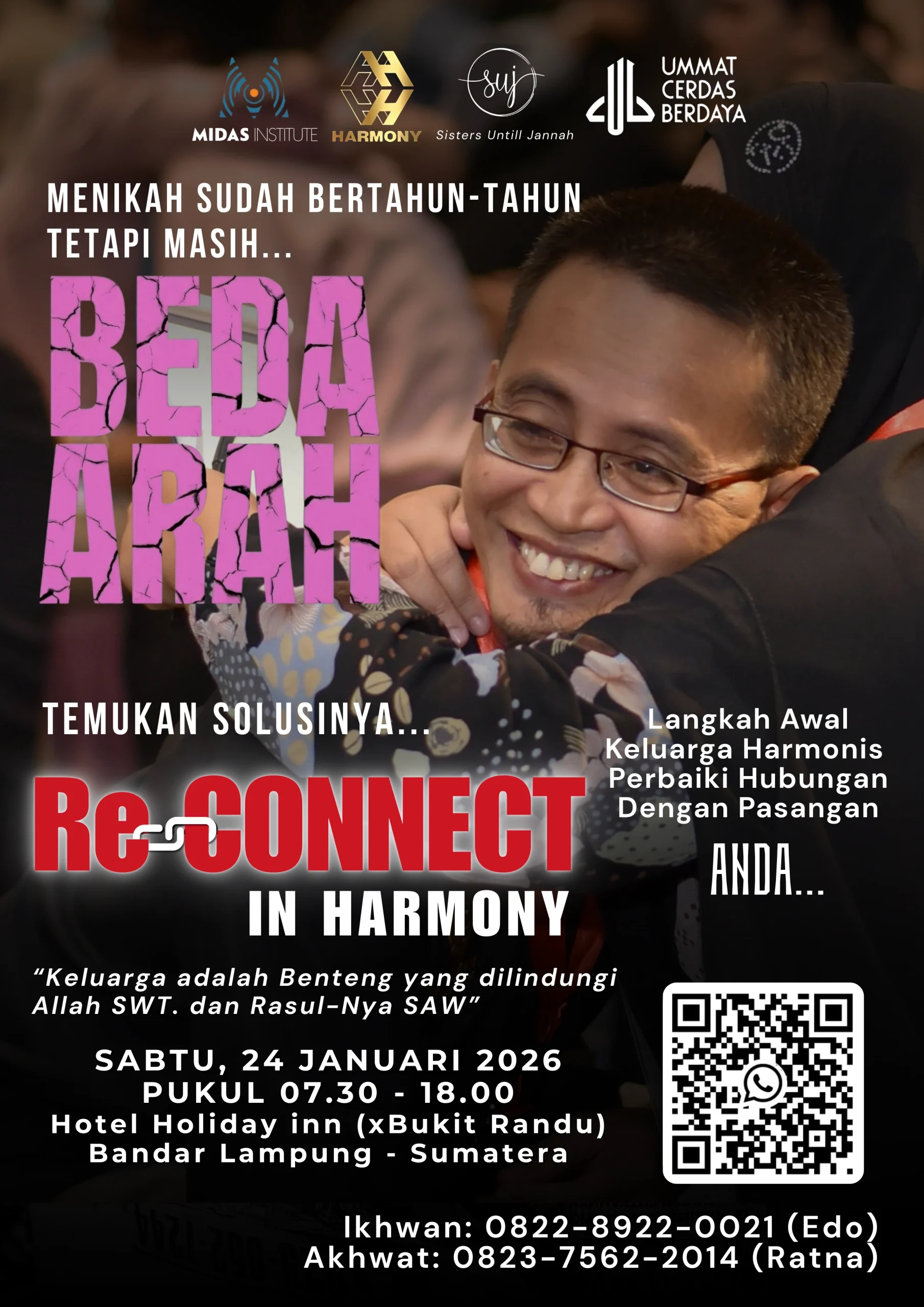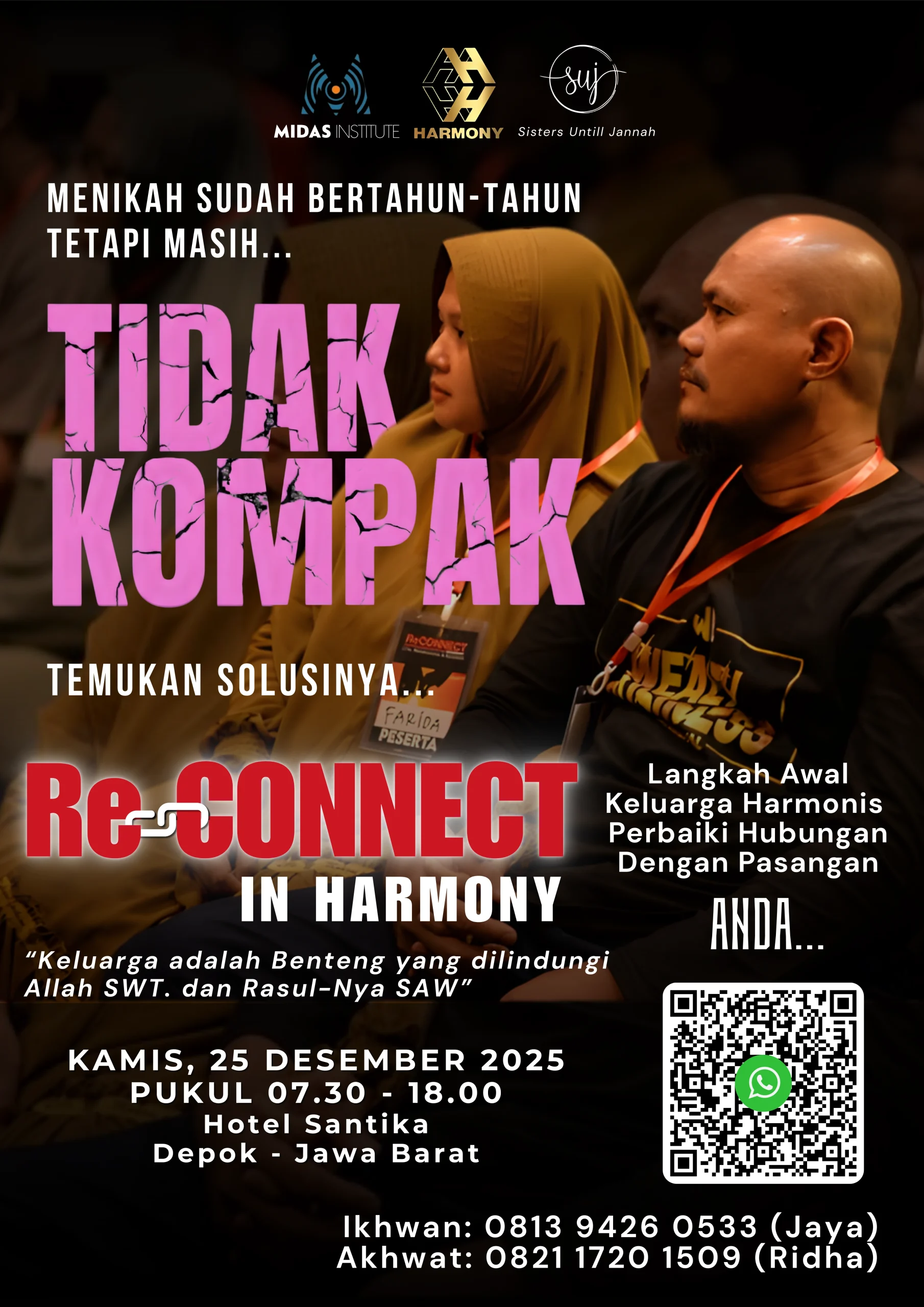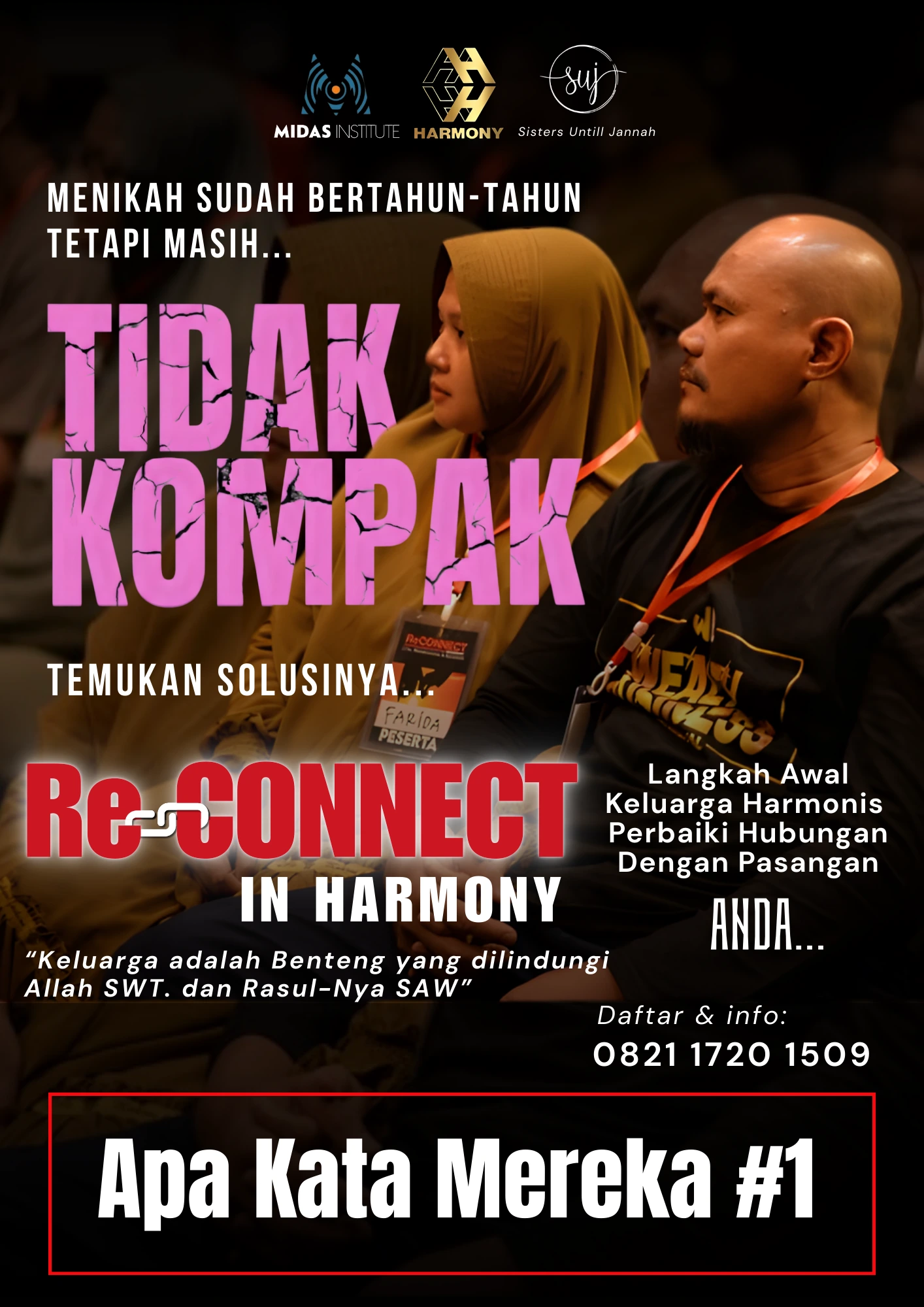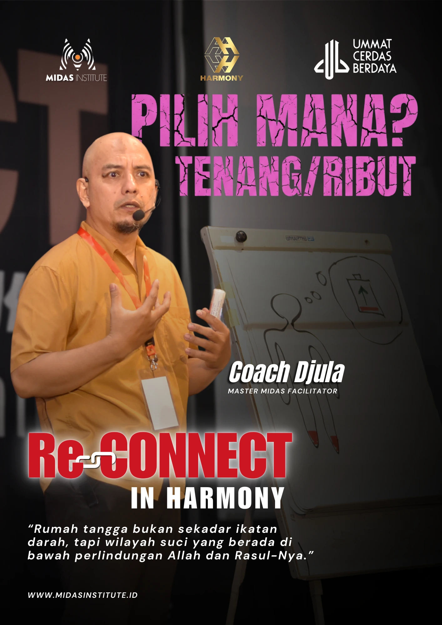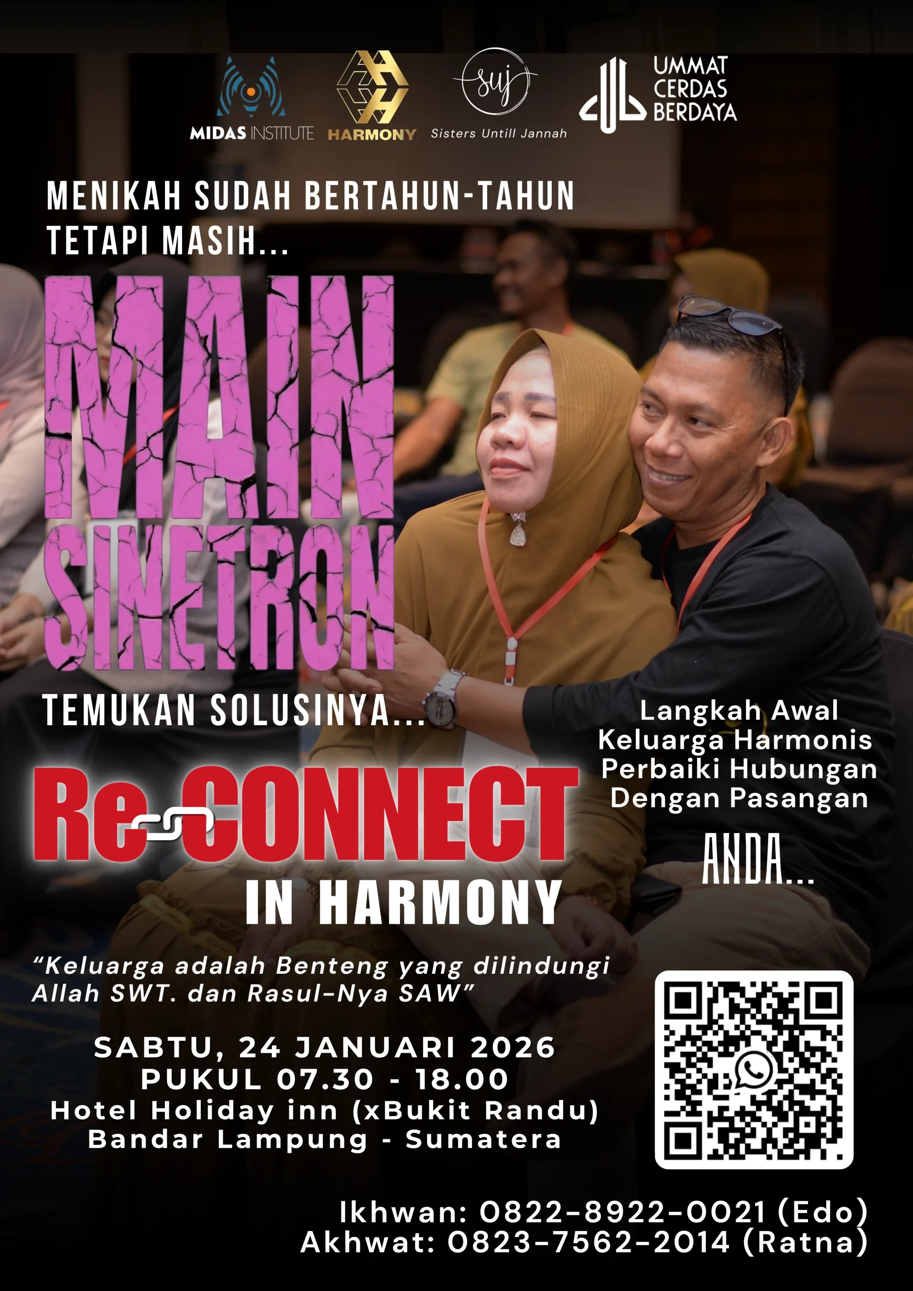 ReCONNECT IN HARMONY disajikan special dari MIDAS Institute. Program ini akan mengungkapkan SUMBER MASALAH UTAMA PASANGAN yang sebenarnya tentang apa yang menyebabkan lebih atau kurang sukses dalam rumah tangga, lebih atau kurang kedamaian batin tanggungjawab sebagai suami istri, hubungan pasangan yang lebih baik atau lebih buruk, Kesehatan mental & emosi pasangan yang lebih baik atau lebih buruk, dan mungkin dianggap sebagai rahasia terbesar bagi teman hidup untuk menuju kehidupan yang lebih baik!