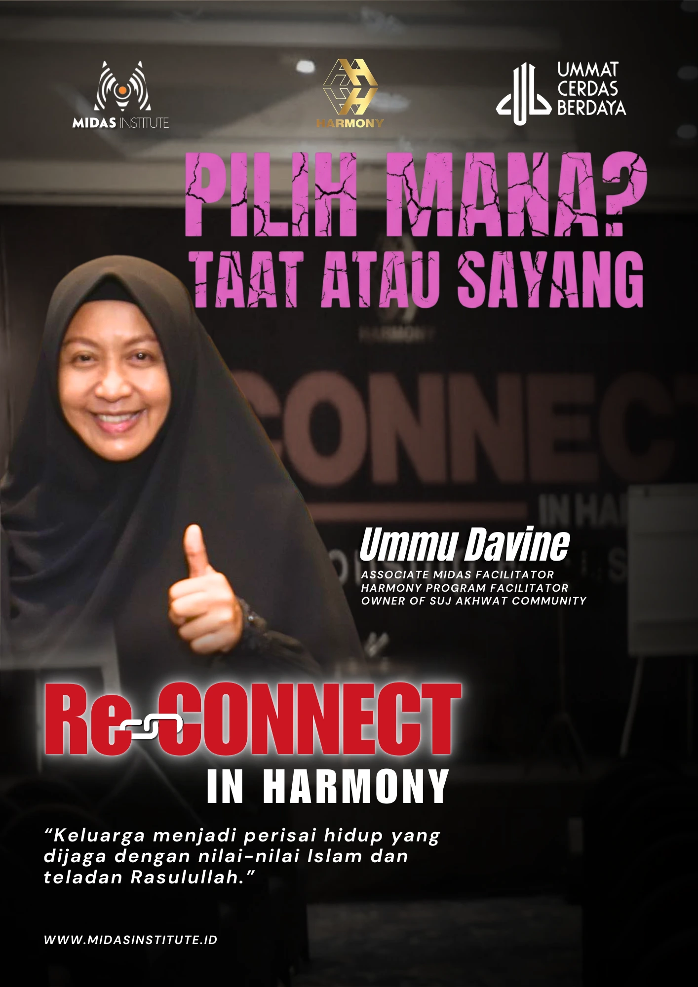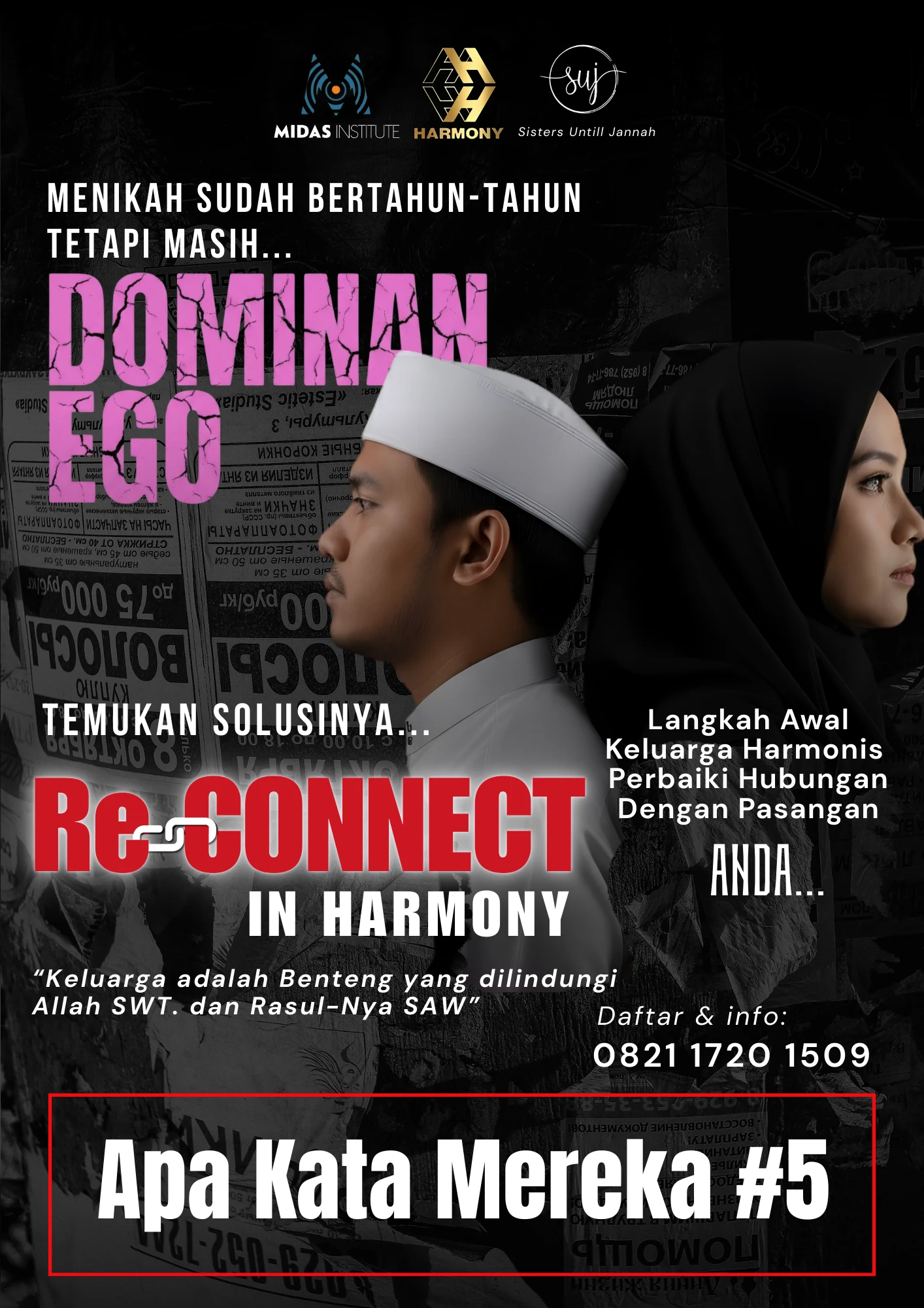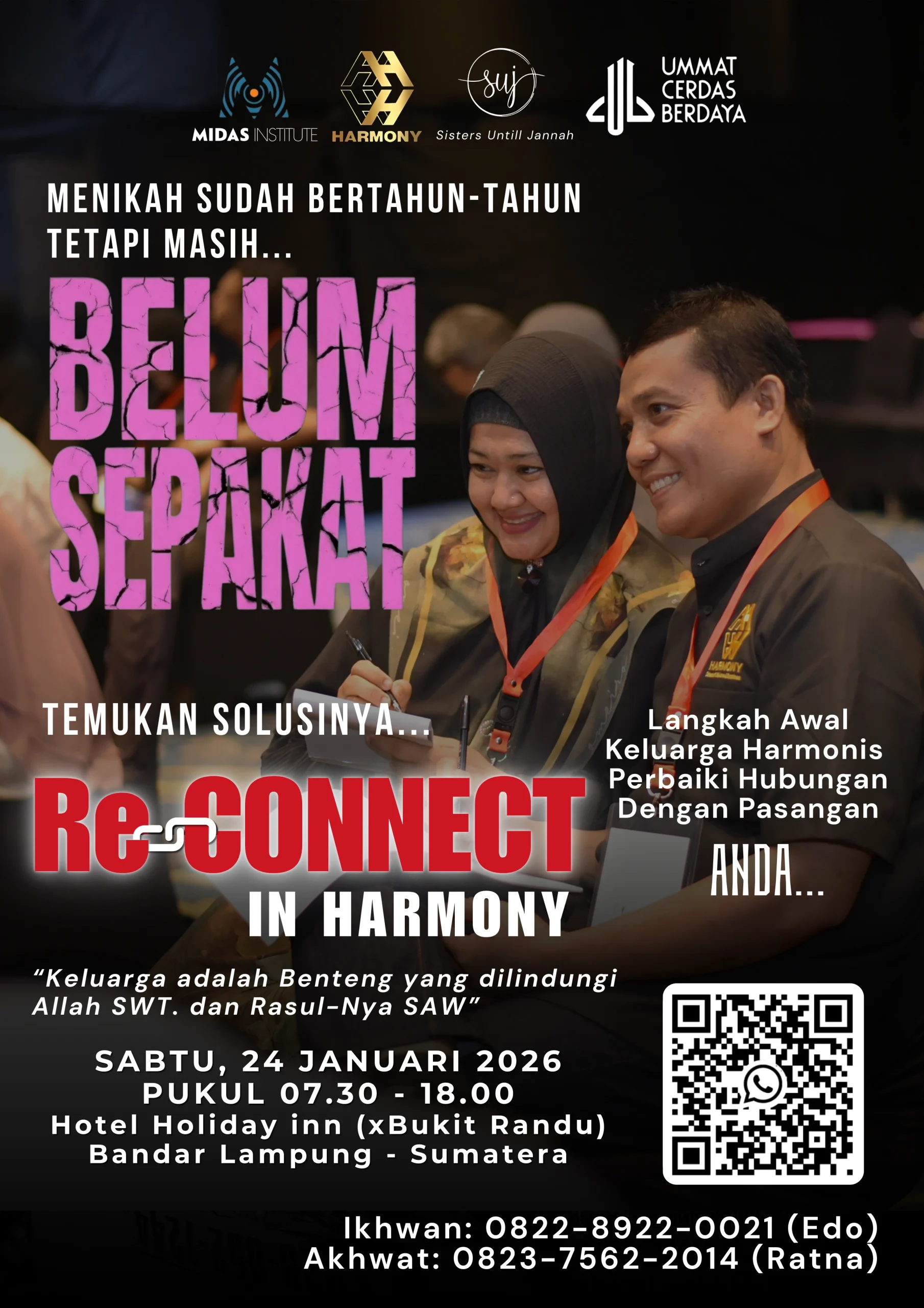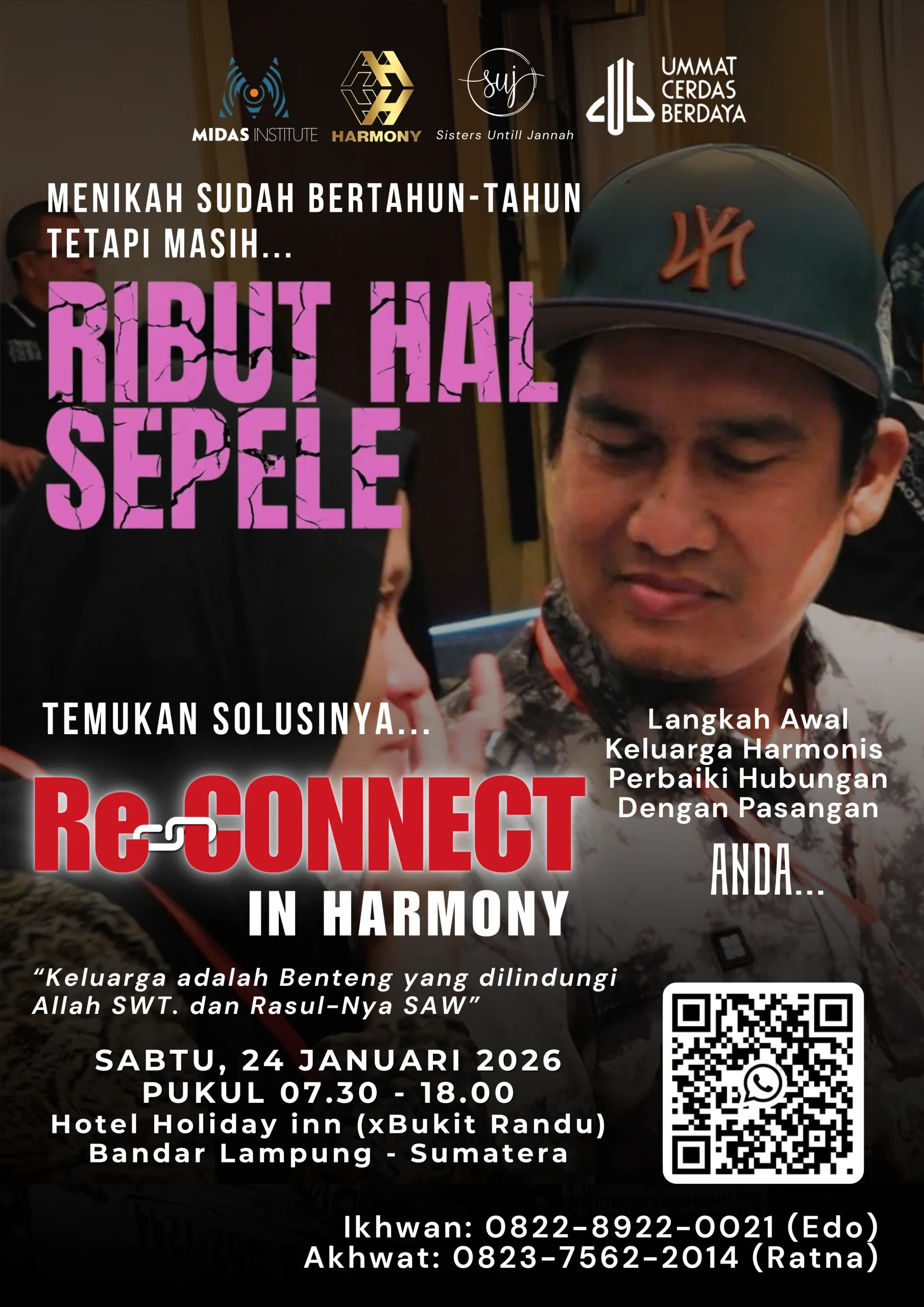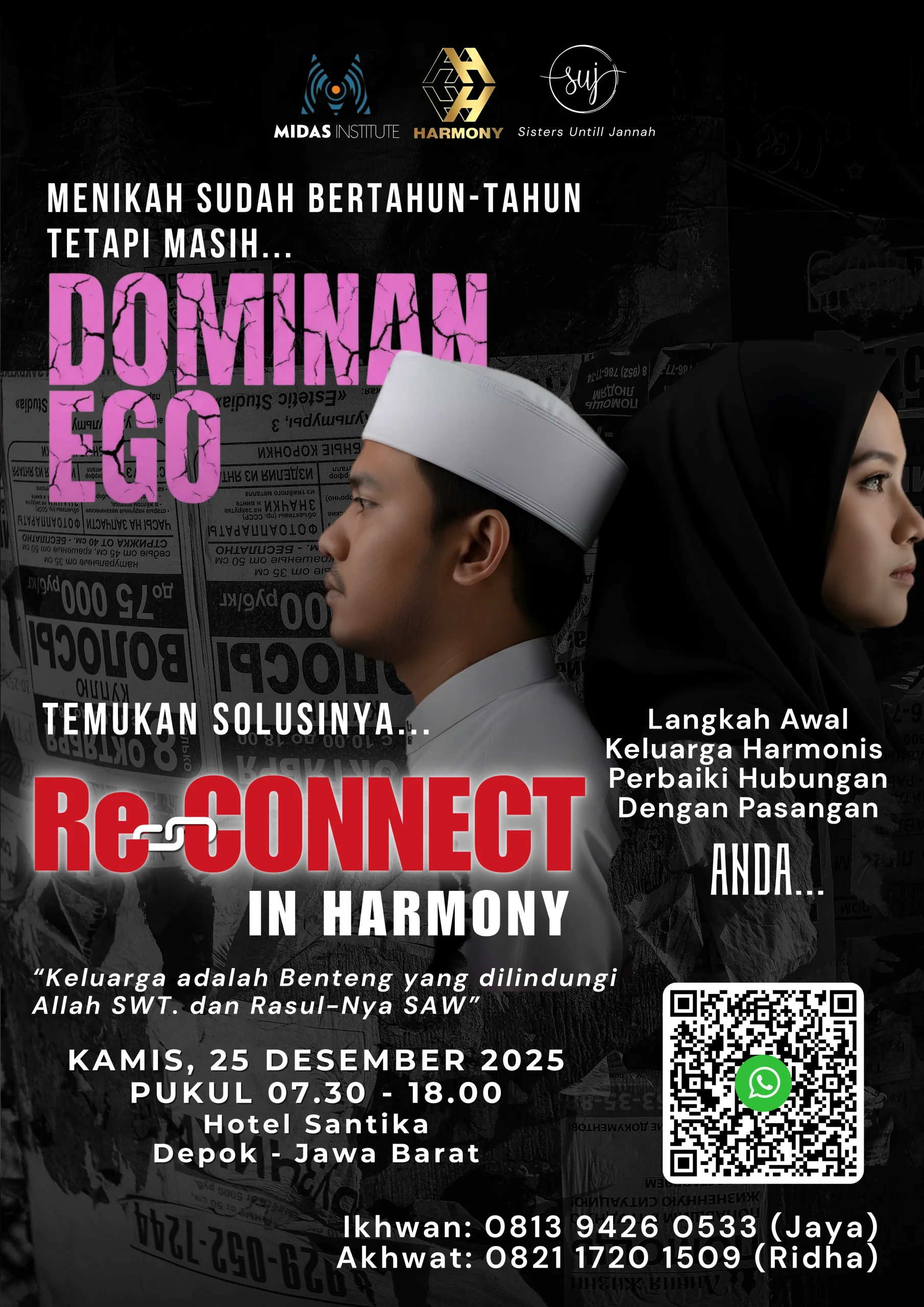 ReCONNECT IN HARMONY disajikan special dari MIDAS Institute. Program ini akan mengungkapkan SUMBER MASALAH UTAMA PASANGAN yang sebenarnya tentang apa yang menyebabkan lebih atau kurang sukses dalam rumah tangga, lebih atau kurang kedamaian batin tanggungjawab sebagai suami istri, hubungan pasangan yang lebih baik atau lebih buruk, Kesehatan mental & emosi pasangan yang lebih baik atau lebih buruk, dan mungkin dianggap sebagai rahasia terbesar bagi teman hidup untuk menuju kehidupan yang lebih baik!